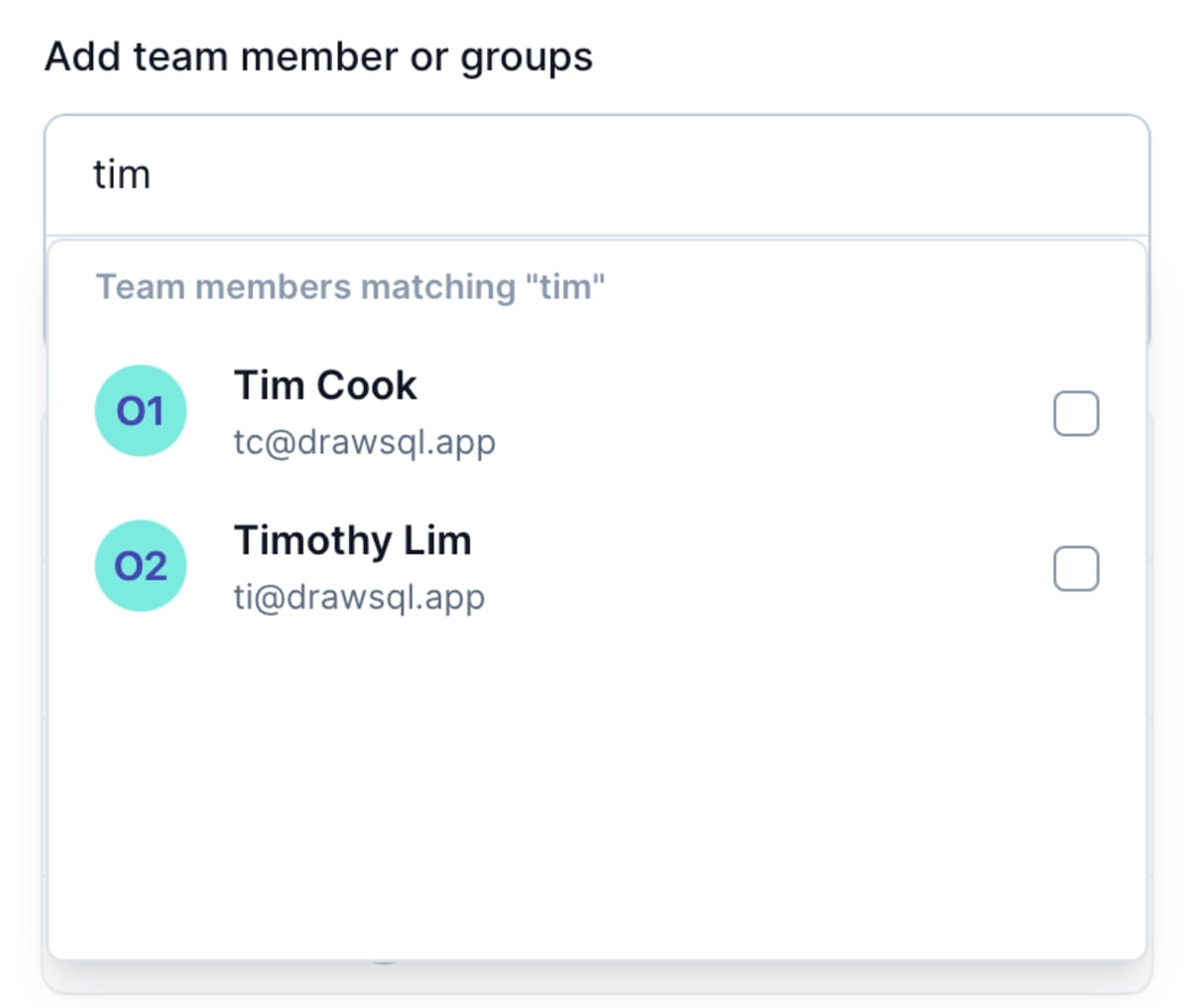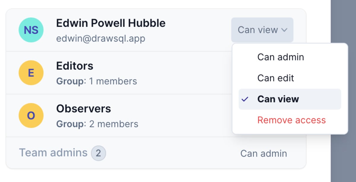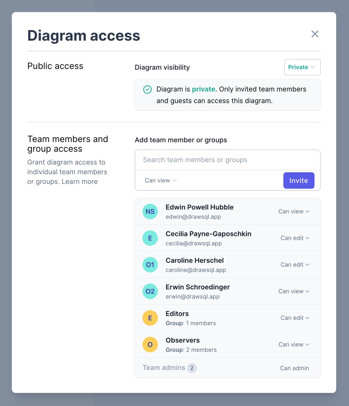 For each database diagram in DrawSQL, the diagram owner, team admins, and users with the "can admin" permission can manage granular permission to determine who can view, edit and admin the diagram. The diagram access modal provides a full list of users and their level of access to the diagram.