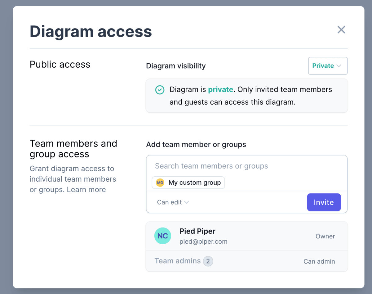 Team admins can also configure one or multiple groups that are automatically added to all new diagrams. Refer to the groups page for more information.