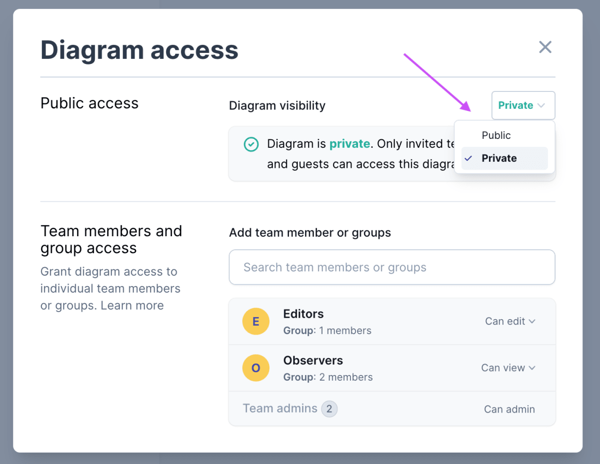 Private - Public access is disallowed. Only team members and invited guests can access the diagram. The access permission of each user (admin, edit, or view) is configured via diagram permissions.